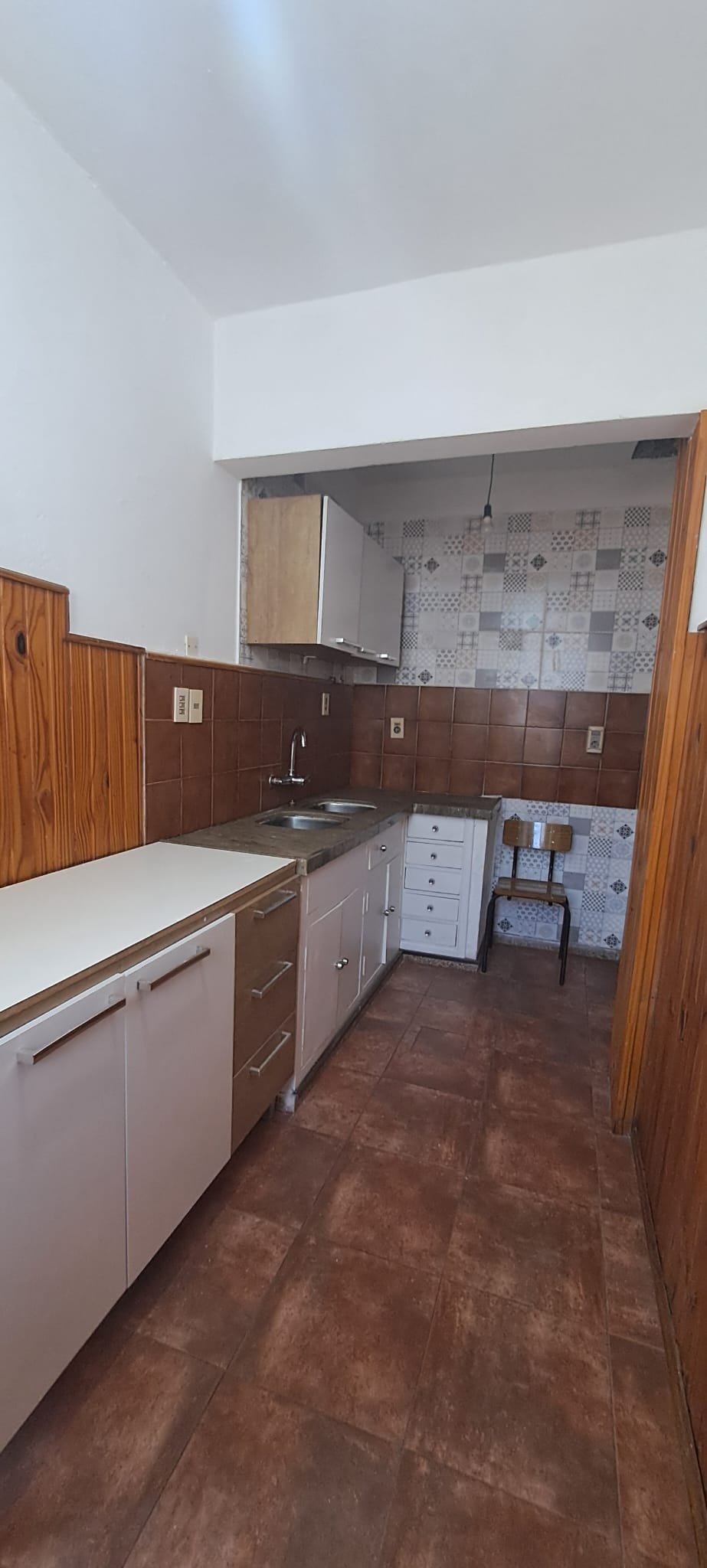 La cocina es cómoda y cuenta con buena ventilación natural, equipada con placares aéreos y bajo mesada.